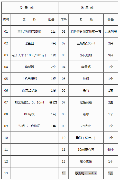 配套齊全,該儀器集藥、器、儀為一體,攜帶方便,相當(dāng)于一個(gè)小型實(shí)驗(yàn)室,用戶只需提供蒸餾水即可在要求時(shí)間內(nèi)完成全部操作。適于農(nóng)業(yè)服務(wù)部門或農(nóng)資經(jīng)銷商鑒別肥料真假、肥料廠商肥料生產(chǎn)中控、農(nóng)資質(zhì)檢部門進(jìn)行農(nóng)資打假,規(guī)范農(nóng)資市場。