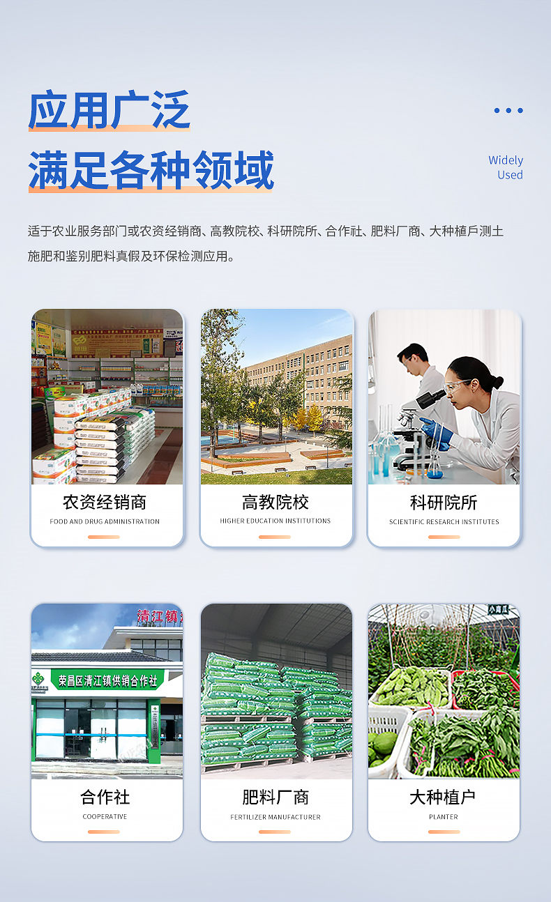 配套齊全:該儀器集藥、器、儀為一體,攜帶方便,相當(dāng)于一個(gè)小型移動(dòng)實(shí)驗(yàn)室,無(wú)需用戶自配附件,亦可靈活野外流動(dòng)測(cè)試。適于農(nóng)業(yè)服務(wù)部門(mén)或農(nóng)資經(jīng)銷商、高教院校、科研院所、合作社、肥料廠商、大種植戶測(cè)土施肥和鑒別肥料真假及環(huán)保檢測(cè)應(yīng)用。