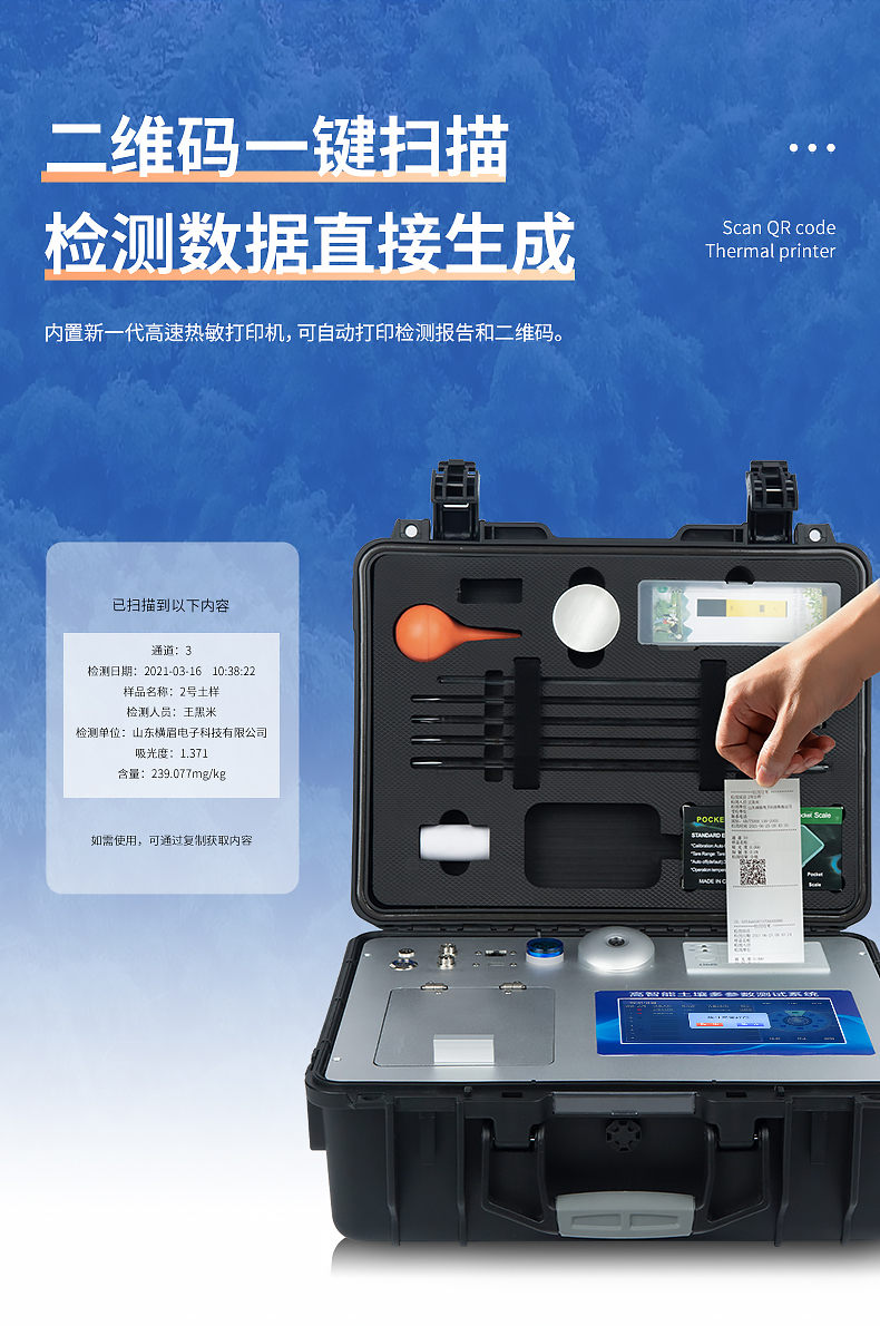 21、內(nèi)置新一代高速熱敏打印機(jī)(無(wú)需色帶),打印內(nèi)容包含:檢測(cè)單位、檢測(cè)人員、檢測(cè)項(xiàng)目、通道號(hào)、吸光度、養(yǎng)分含量(mg/kg)、檢測(cè)時(shí)間、以及二維碼等信息