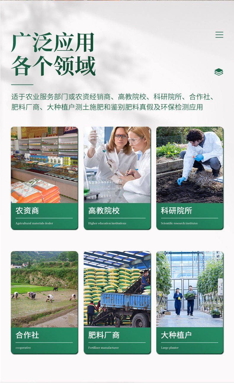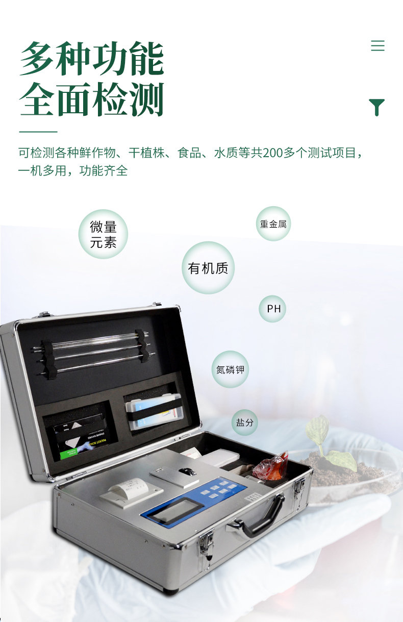 4、全項(xiàng)目土壤肥料養(yǎng)分檢測儀可檢測土壤及化肥、有機(jī)肥(含葉面肥、水溶肥、噴施肥等)、植株中的速效氮、速效磷、有效鉀、全氮、全磷、全鉀、有機(jī)質(zhì)、酸堿度,鈣、鎂、硫、鐵、錳、硼、鋅、銅、氯、硅、鉬等各種中微量元素以及鉛、鉻、鎘、汞、砷、鎳、鋁、氟、鈦、硒等各種重金屬含量。