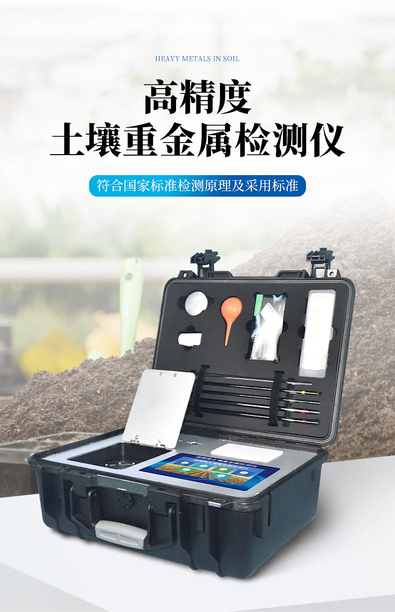 土壤重金屬污染問題日益嚴(yán)重,造成土壤耕作層內(nèi)的鎘、銅、砷、鉻、汞、鎳、鋁、氟、鈦、硒、鐵、鋅、錳、銅等重金屬大量富積、積累,成為當(dāng)下面臨的主要環(huán)境問題之一。土壤中的重金屬通過在作物體內(nèi)富集進(jìn)入食物鏈,對人畜健康造成嚴(yán)重威脅。有色金屬礦山的開采、 工業(yè)“三廢”的排放、含重金屬廢棄物堆積、農(nóng)業(yè)生產(chǎn)中的污水灌溉,農(nóng)用化學(xué)藥品的不合理使用等,都可能導(dǎo)致有害重金屬元素直接或間接進(jìn)入土壤,導(dǎo)致土壤、作物、果蔬、水質(zhì)、水產(chǎn)品等重金屬含量嚴(yán)重超標(biāo)。但是當(dāng)前重金屬測定方法測定速度慢、步驟繁瑣且儀器昂貴。基于這種形勢,我們開發(fā)出了重金屬快速測定方法。