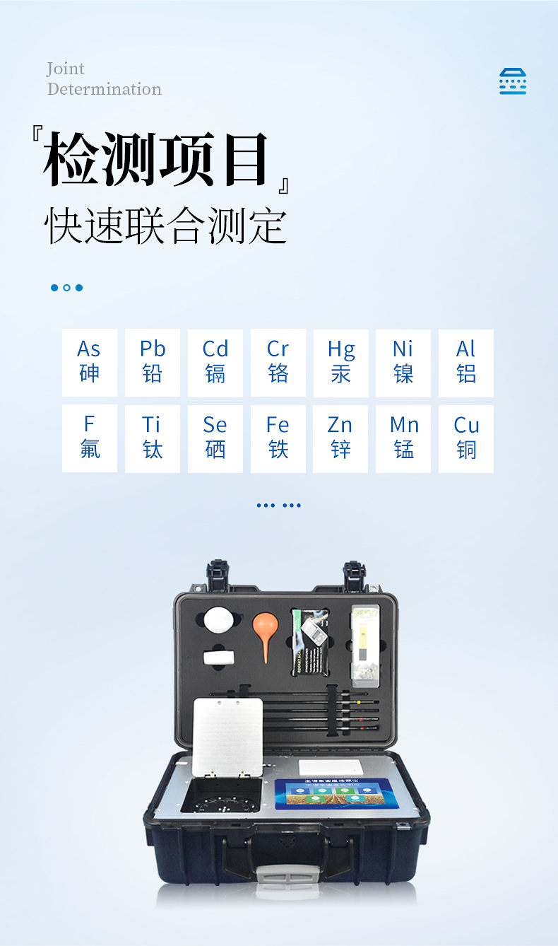 可對土壤、肥料、作物、蔬菜、水果、水質(zhì)、食品等樣品中的砷、鉛、鎘、鉻、汞、鎳、鋁、氟、鈦、硒、鐵、鋅、錳、銅等進(jìn)行快速聯(lián)合測定。